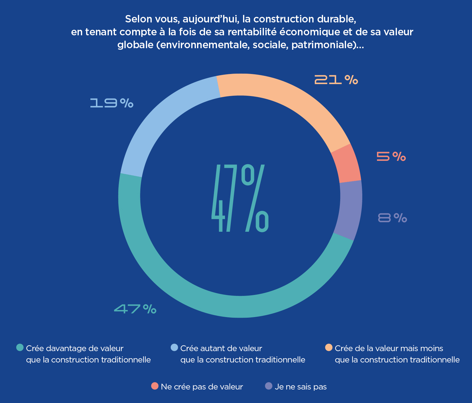 Au-delà de la connaissance de la construction durable, la question de la valeur s’avère décisive. 47 % des parties prenantes estiment que la construction durable crée davantage de valeur que la construction traditionnelle (nouvelle question en 2026). Cette perception est plus fragile dans certaines zones (38 % en Asie-Pacifique, 45 % en Europe) et chez les élus, dont seuls 34 % se déclarent convaincus.